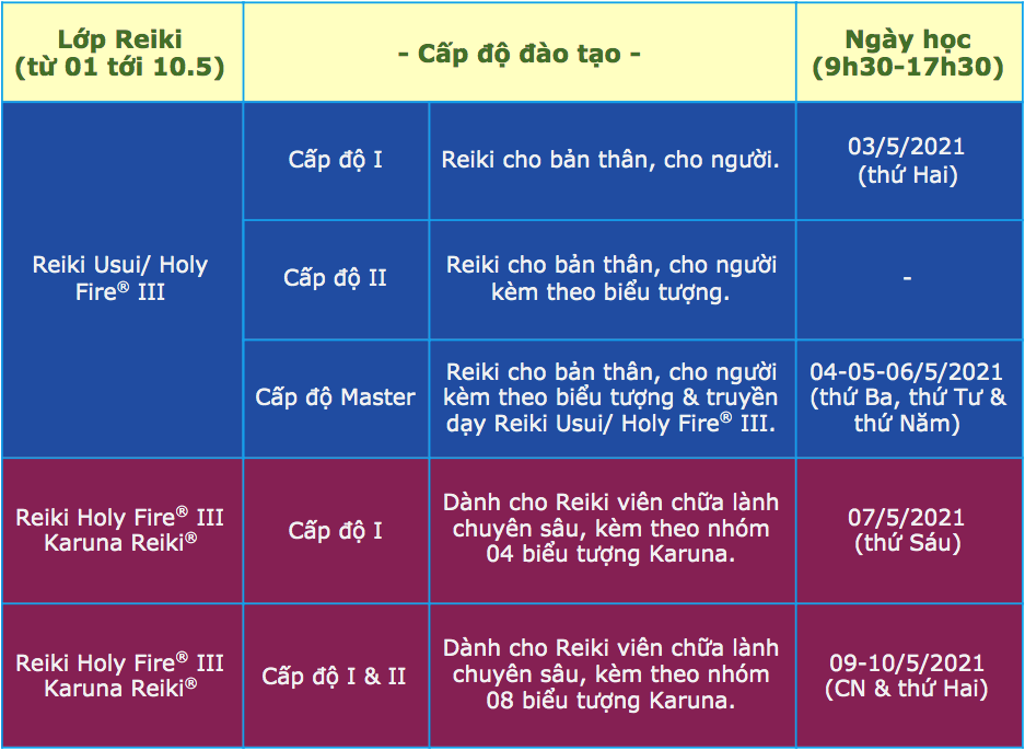 Xin gửi các bạn lịch khóa học trực tiếp 10 ngày đầu tháng 5.2021 tại Reiki Chữa lành HIRC 174 Lạc Long Quân: như ảnh liền sau đây.