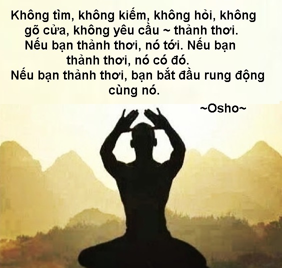 Để phẩm chất này xuyên thấu vào mọi điều bạn làm: ăn, ngủ, làm tình, bước đi, nói, là im lặng. Để phẩm chất này thấm vào sự tồn tại của bạn, toả khắp sự tồn tại của bạn. Để phẩm chất này bao giờ và bao giờ cũng bao quanh bạn; ngay cả rơi vào giấc ngủ vẫn cảm thấy được bao quanh bởi nó. Và bạn sẽ sớm thấy rằng thiền không phải là hành động của bạn, không là hoạt động; nó có sắc thái nào đó, phẩm chất âm nhạc nào đó trong con người bạn, sự hài hoà nào đó, có giai điệu, mà bạn mang tới mọi hành động – dù bạn đang làm bất kì cái gì.