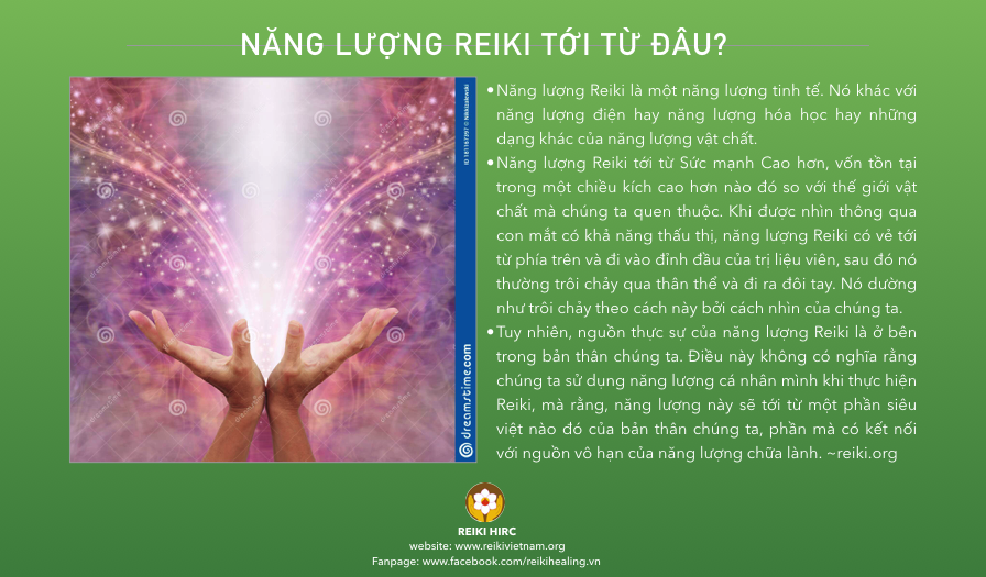 Tuy nhiên, nguồn thực sự của năng lượng Reiki là ở bên trong bản thân chúng ta. Điều này không có nghĩa rằng chúng ta sử dụng năng lượng cá nhân mình khi thực hiện Reiki, mà rằng, năng lượng này sẽ tới từ một phần siêu việt nào đó của bản thân chúng ta, phần mà có kết nối với nguồn vô hạn của năng lượng chữa lành. ~reiki.org