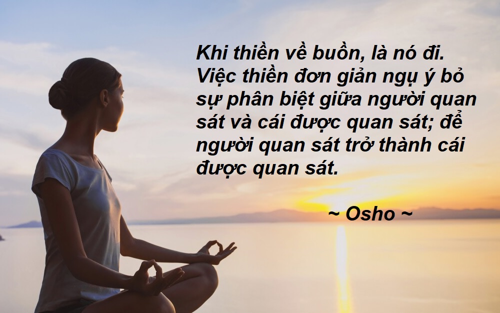 Đó là điều thiền tất cả là gì: chỉ là miếng bọt biển. Và khi tâm trạng này có đó, thấm đẫm trong nó tới toàn bộ năng lực của bạn, tới điều tối ưu. Khi thiền về buồn, là nó đi. Việc thiền đơn giản ngụ ý bỏ sự phân biệt giữa người quan sát và cái được quan sát; để người quan sát trở thành cái được quan sát. Bỏ cách phân loại cũ về đối thể và chủ thể; biến mất vào trong đối thể của thiền của bạn. Không đứng xa cách, không là khán giả. Các bí mật không được hiển lộ cho khán giả; các bí mật được hiển lộ chỉ cho những người lấy cú nhảy, người chìm sâu vào trong cái gì đó, người không giữ bản thân họ lại.