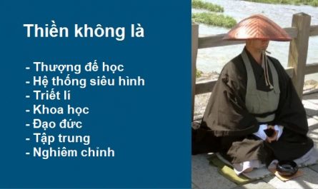 Ngồi yên, thn lặng, không nói, tâm trí an bình, để ý nghĩ và cảm xúc, bất kì cái gì nảy sinh, tới rồi đi, không bám vào bất kì cái gì.