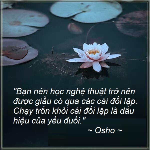 Chúng ta không thể thoát được cái đối lập. Cái đối lập bao giờ cũng đứng cạnh. Nếu bạn muốn ngủ ban đêm, bạn sẽ phải nỗ lực ban ngày. Nỗ lực càng lớn, giấc ngủ càng sâu. Cho nên một điều rất thú vị xảy ra: Những người làm viếc rất vất vả, và không có thời gian để thảnh thơi, đạt tới chiều cao của thảnh thơi. Và những người có mọi phương tiện để thảnh thơi – với họ, thảnh thơi là vấn đề gây lo âu. Làm cái gì họ có thể làm, họ vẫn không thể thảnh thơi.